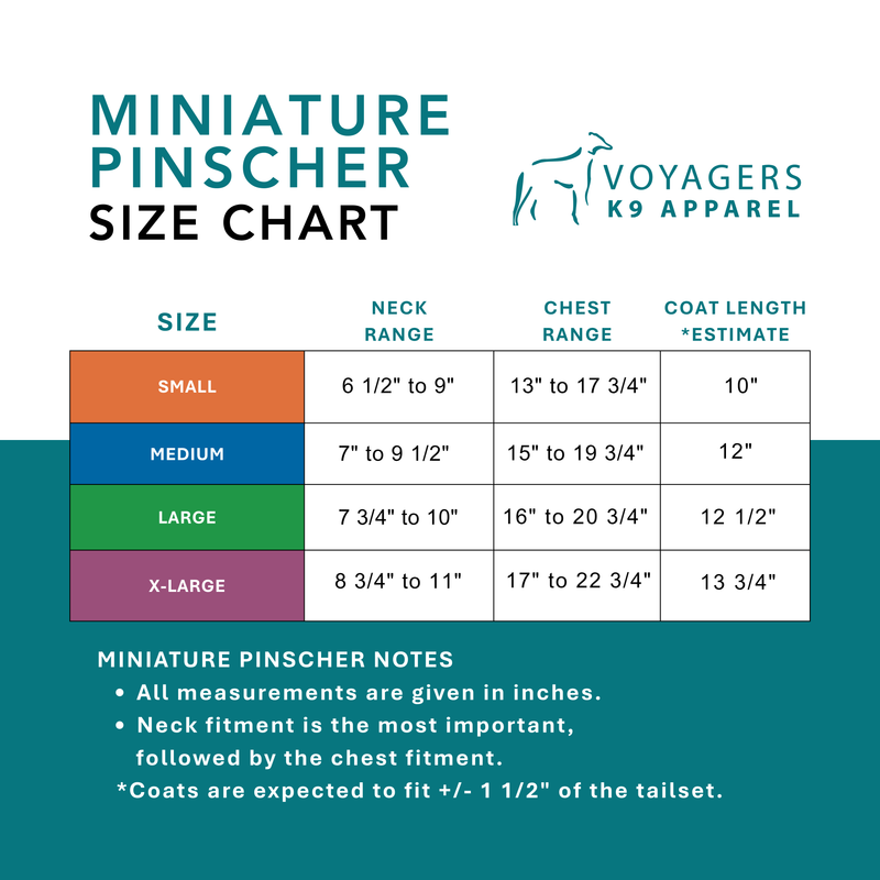 Your Miniature Pinscher is eager to get outside. They are full of energy, very playful and athletic. They are great companions who look forward to spending time with you outdoors. Their small size and short coat make them sensitive to the cold, so keep them protected in Voyagers K9 Apparel.